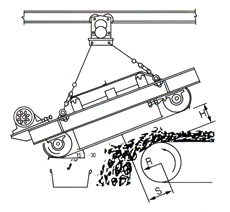 (2)非帶式電磁除鐵器:必須選擇電動行走小車 。以便電控自動吸、棄鐵。輕型特別是三吊點的除鐵器,一般選擇電動單軌單車吊掛。重型設四吊點的除鐵器可以選擇電動雙軌或單軌組合行走架。重型設三個吊點的可以選擇電動單軌組合行走架。